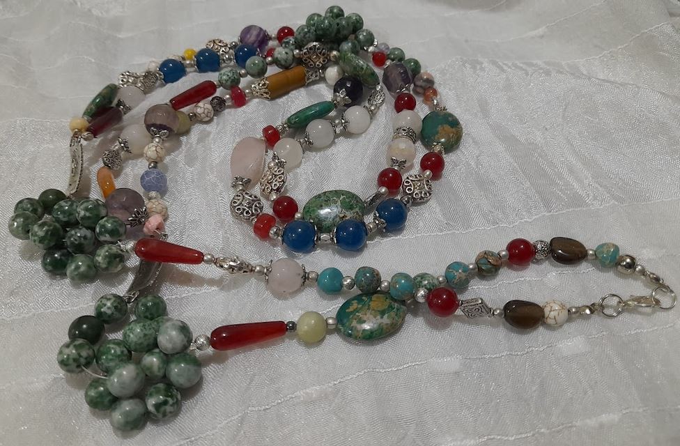 „Beauty Forest” nyaklánc Jamaikábó, két fonott szállal, fa achát, rózsakvarc, angyalit, rubin csepp, fagy achát, óceáni jáspis, fehér howlit, fazettált rubin, tibeti ezüst elemekkel. Egy igazi energiakoktél!