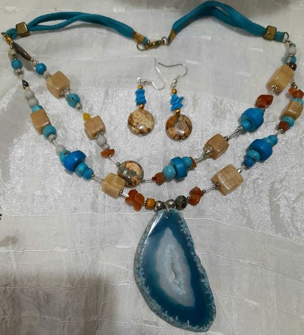 A medál egy achát geóda. A fülbevaló kerek jáspis és türkiz gyöngyökből készült, ezüst és zsinór elemekkel.