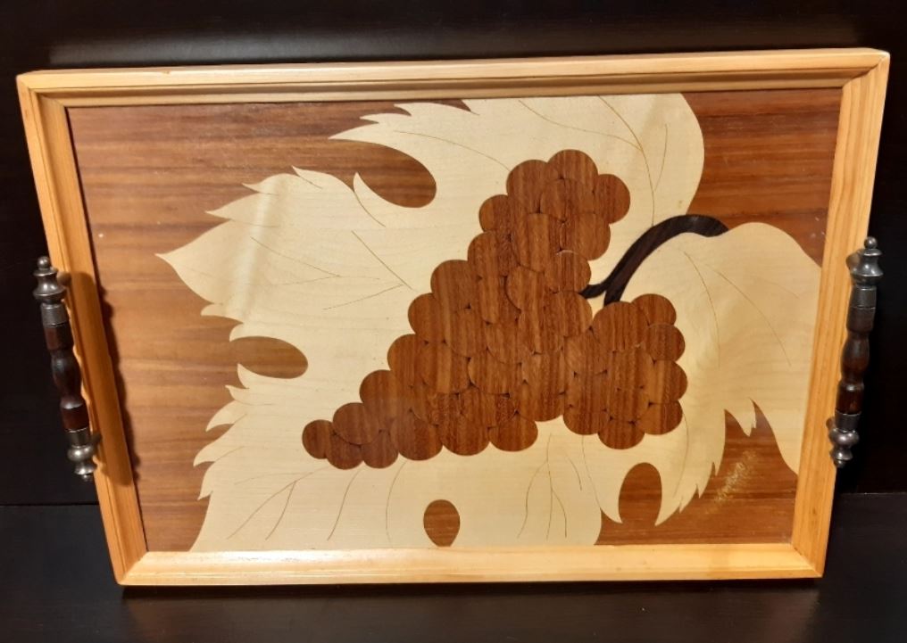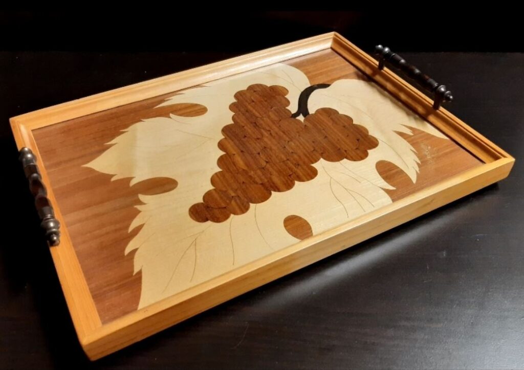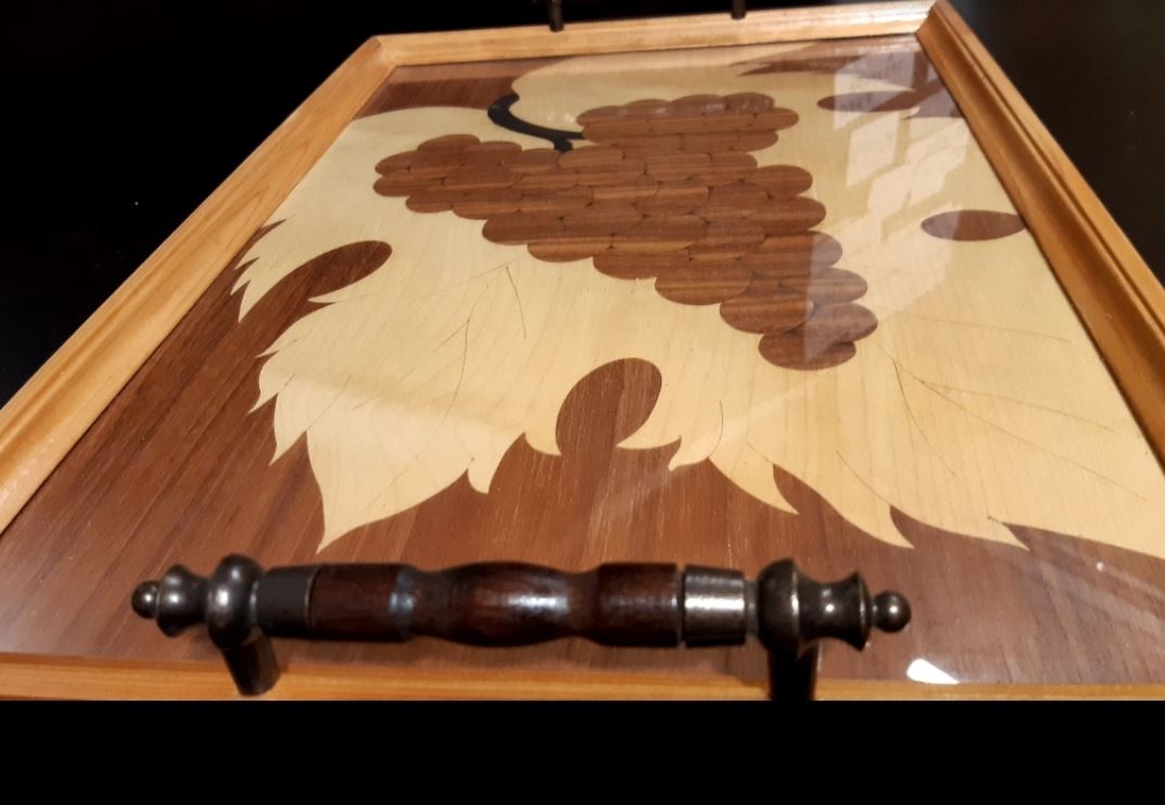 Saját készítésű fa intarziás tálca üveglappal védve.