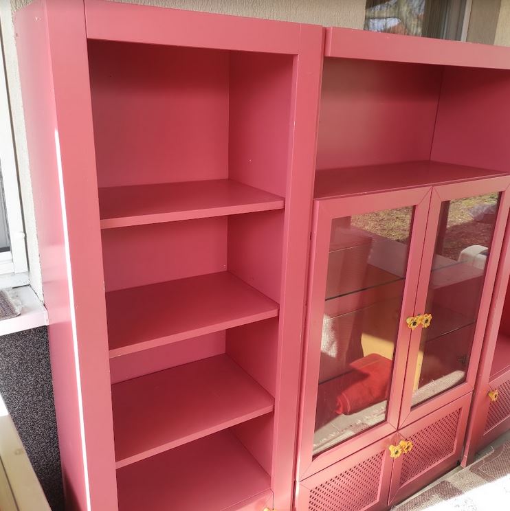 A másik két szekrény egyformán 4 polcos + 1 ajtóval zárt polc alul.
